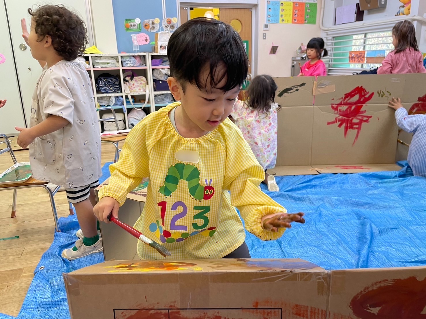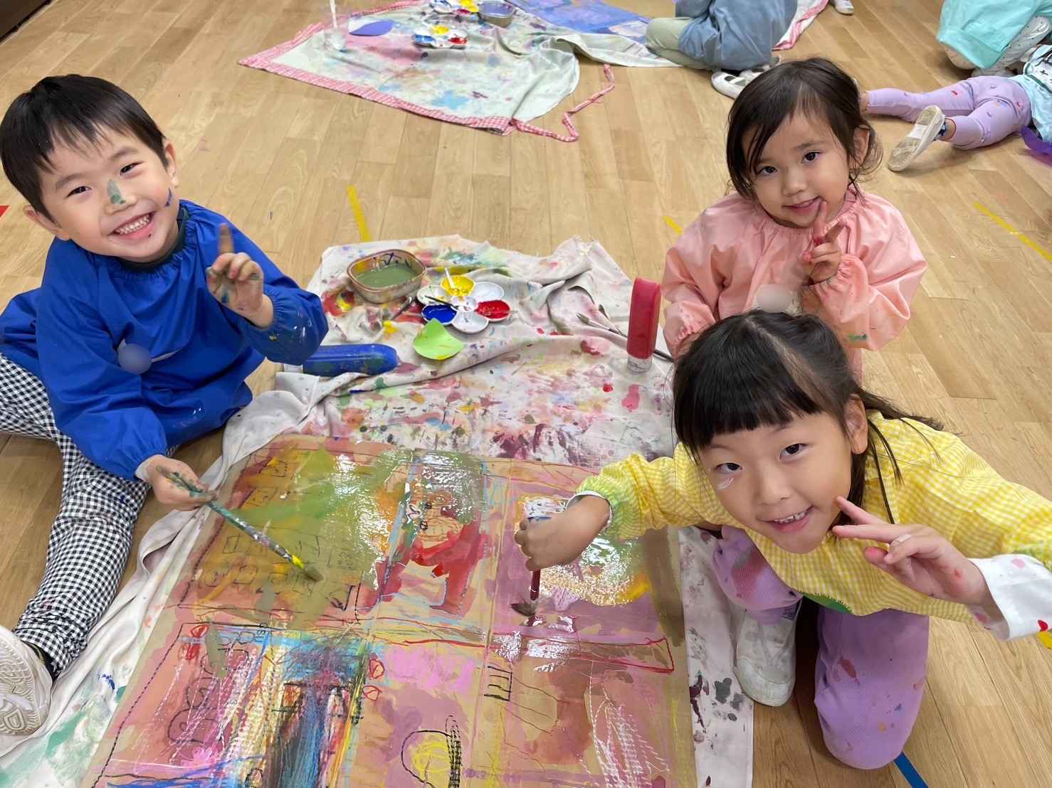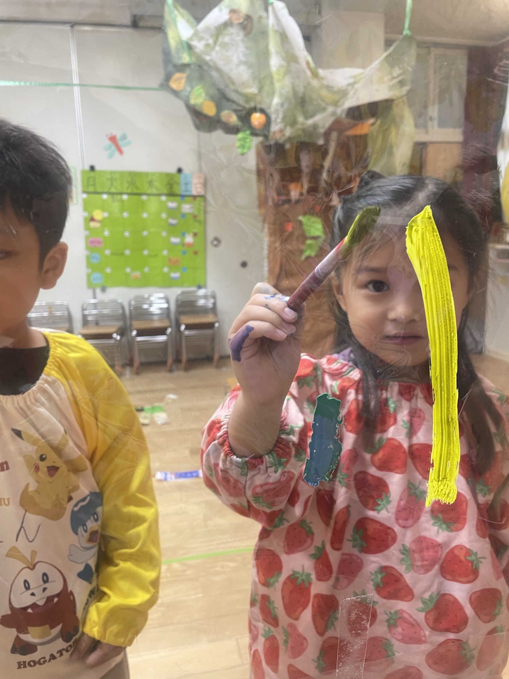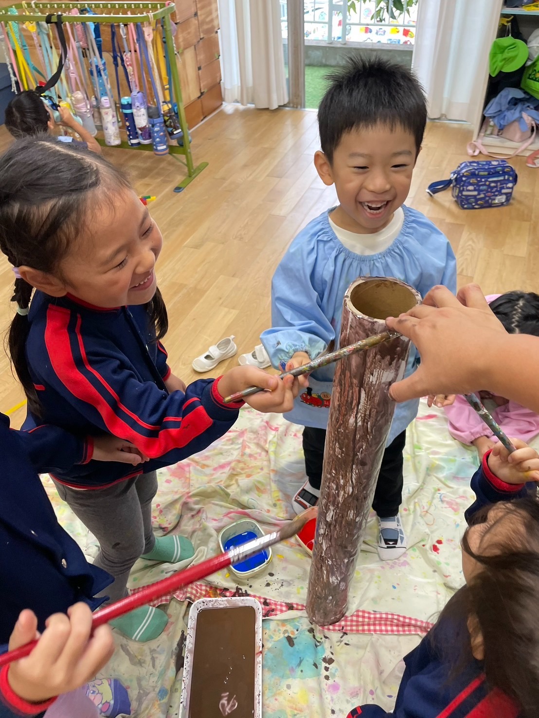 きょうだいクラス:秋のトンネル作りで、ビニールにお絵描き♪