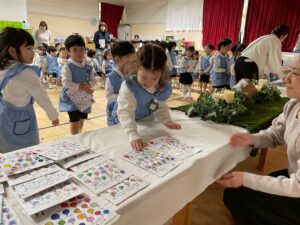 「どんなお気持ちを献金したの??」と子どもたちに聞くと「つぼみさんが坂で困ってたから助けてあげた」「ママのお手伝いしたんだ!」「お友達にハンカチ探してあげた」など神様が喜ぶ優しいお心を献金したお話をたくさん教えてくれました。このお気持ちを心込めてお捧げし、2学期を終えることができました。3学期、元気なお声がまた園舎に響く日が楽しみです!