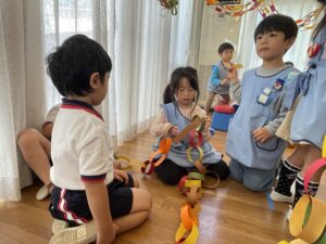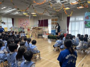 各クラス、秋の素材を使ったバスやツリーハウス、町やキンモクセイの木をお部屋に作って深まる秋を楽しんできた子どもたち。当日はそのような環境の中で、様々な形で感謝のお気持ちをお伝えしました。
