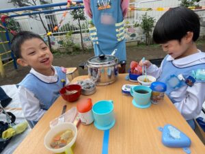 最後は秋空の下で、お手伝いのお父様・お母様方が作った、お芋掘りで掘ったさつまいもの『芋鍋』や秋のフルーツをいただき、心も体もあたたかい1日を過ごしました。