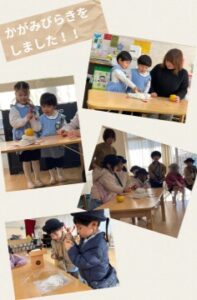 各クラスでは、12月のおもちつきで作った鏡餅で鏡開きをしました。「カチカチだ~」「あけましておめでとうって言って開こうよ!」「よいしょ~!よいしょ~!」と力を合わせて開き、新しい年を迎えた喜びを皆で感じながら過ごしました。明日、お汁粉にしていただくことを今から楽しみにしている子どもたちです!