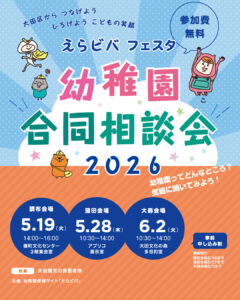 2026年4月20日 幼稚園合同相談会えらビバフェスタ2026に参加します えらビバフェスタ幼稚園合同相談会 https://www.eraviva.com/3946/ 日時:2026年6月2日(火) 10時30分~14時 場所:大田文化の森 多目的室 ぜひお待ちしております♪